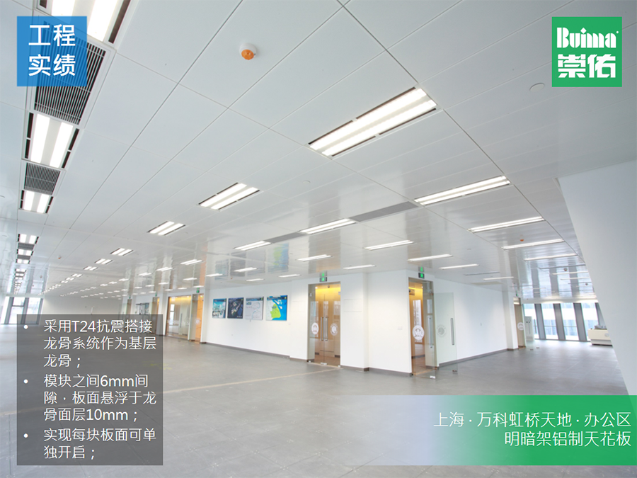 崇佑(中國)的這款明暗架天花系統的板面可采用鋼制天花板也可采用鋁制天花板,可以根據設計師對空間不同的述求進行選擇。如需防火時效,則采用鋼制天花板;如需輕便且對防火要求不高,則采用鋁制天花板。這個明暗架系統天花可以做組合式天花吊頂系統的結構,可以通過300*300(mm)、300*1200(mm)、400*1200(mm)、600*1200(mm)、1200*1200(mm)這些尺寸,來滿足設計師對空間不同功能區的劃分。再者,這款天花系統,采用了明架系統的優勢,就是龍骨系統本身是抗震防火龍骨,可以廣泛應用于地震帶項目或者對防火時效有要求的場所;另外又結合了暗架系統的優勢,便利拆卸安裝且自帶防風結構,這樣就不會存在因為空間氣流問題而突然被掀翻的天花板砸到人的問題。